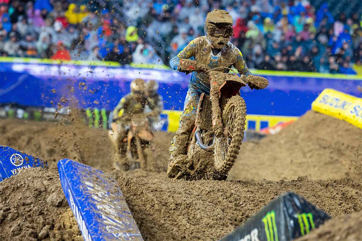 Heat 2, however, marked a milestone moment for the team. Joey Savatgy grabbed the holeshot and led early, navigating the fine line between speed and survival in the mud. After briefly losing the lead, he regrouped and charged back to take the win, securing both his and the team’s first premier class heat race victory. McElrath added to the momentum, charging from the back to 4th. All four riders advanced to the main event.